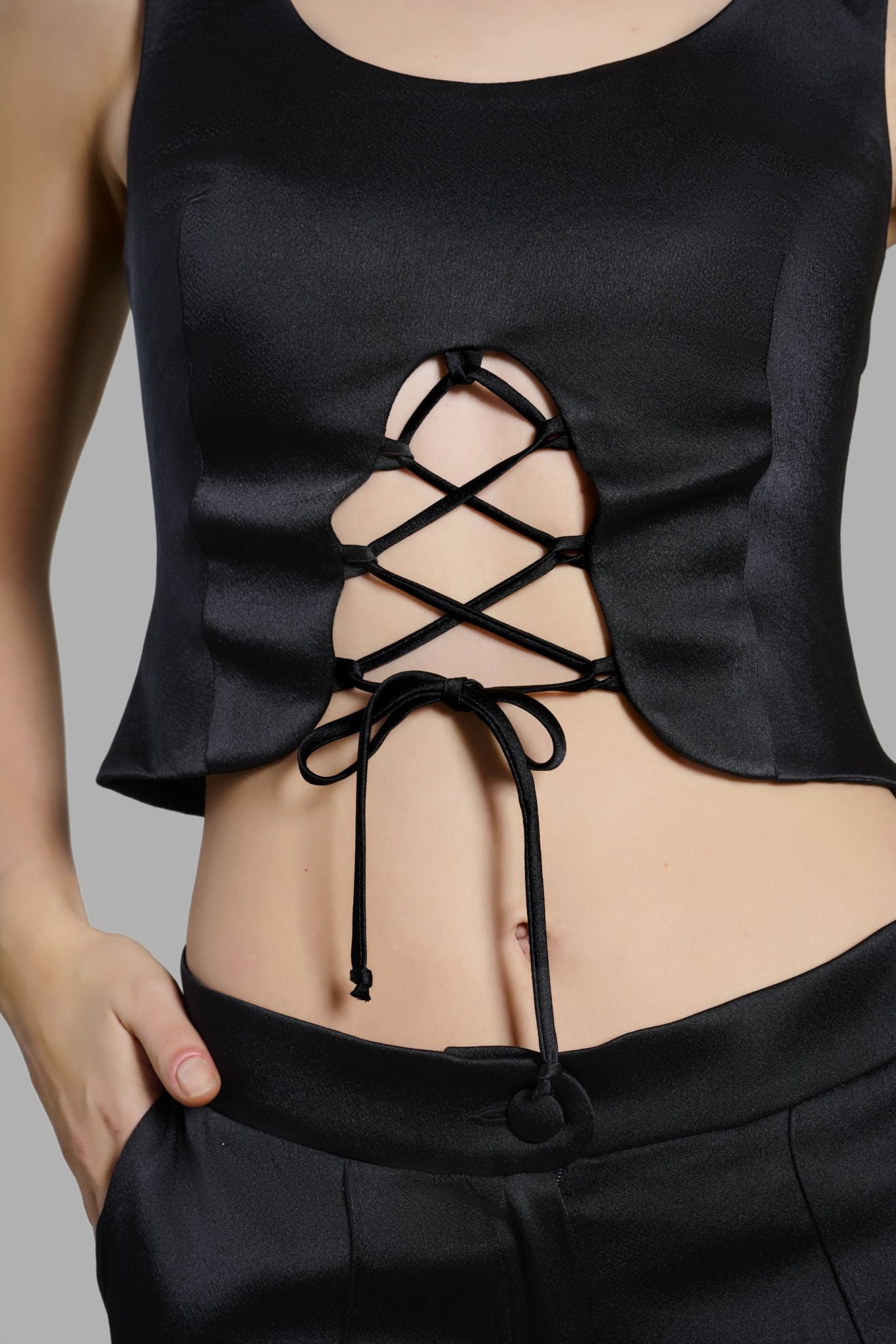 Black Satin Corset Top with Ribboned Cut