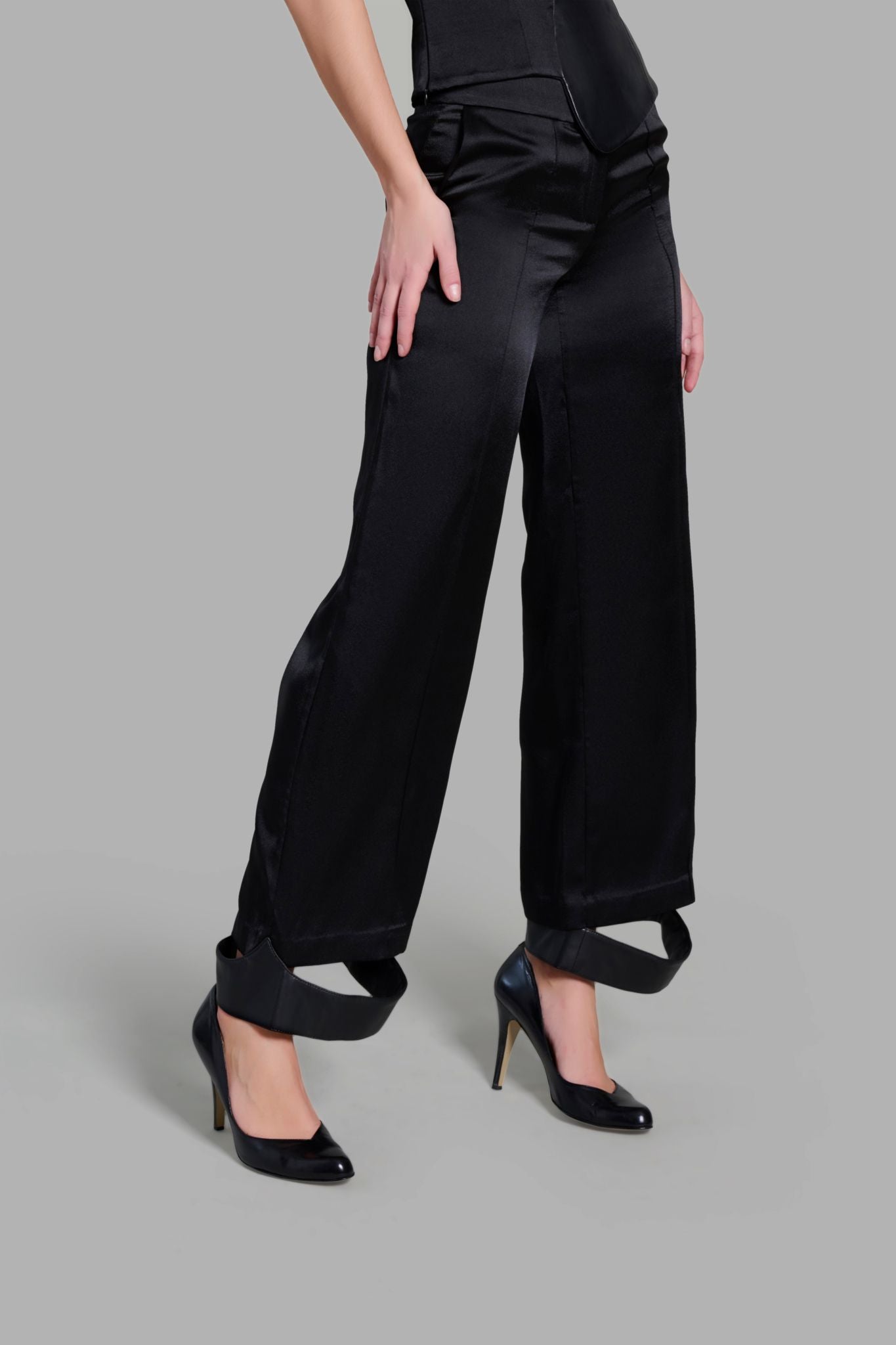 Black Satin Pants with Ribboned Cut