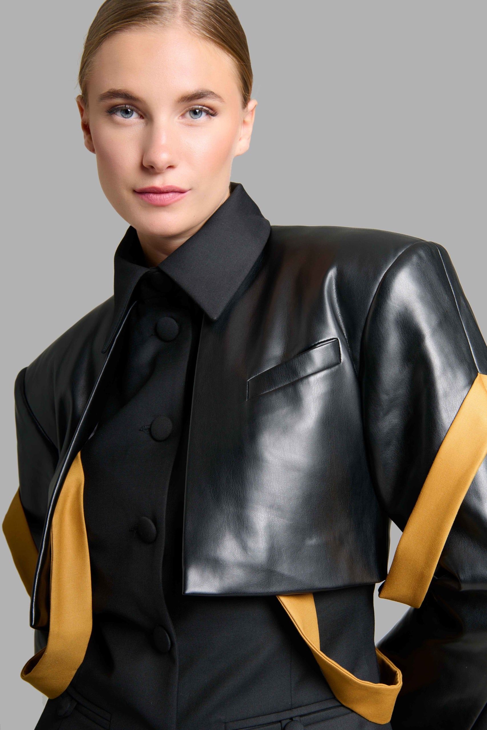 Black Faux Leather High-Neck Cropped Blazer