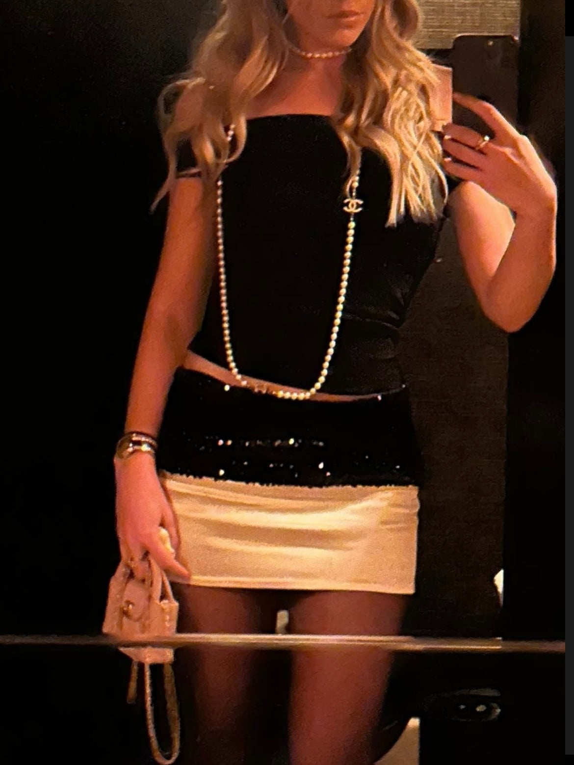 This product is styled with the Black and White Sequin Choker Top.