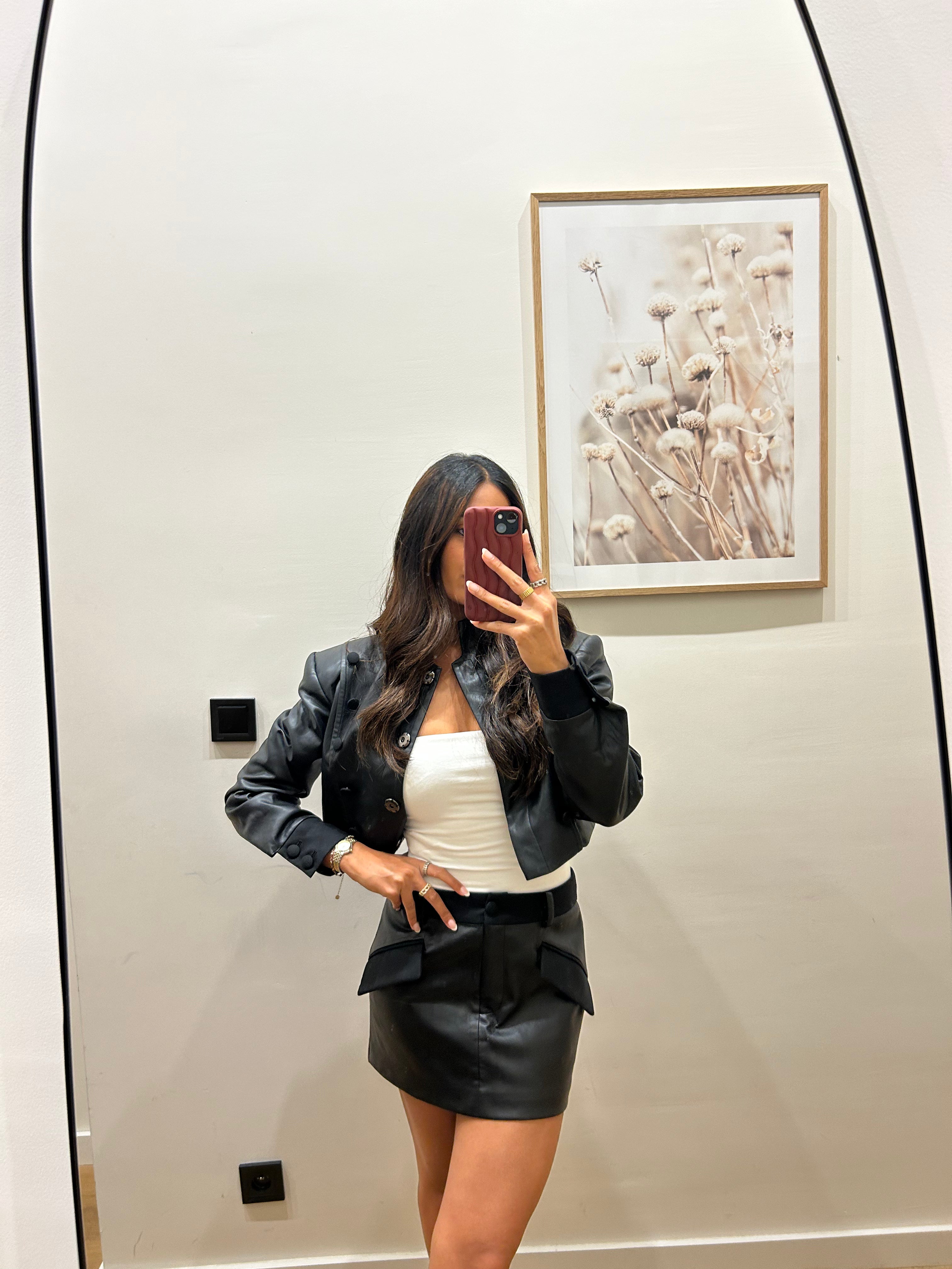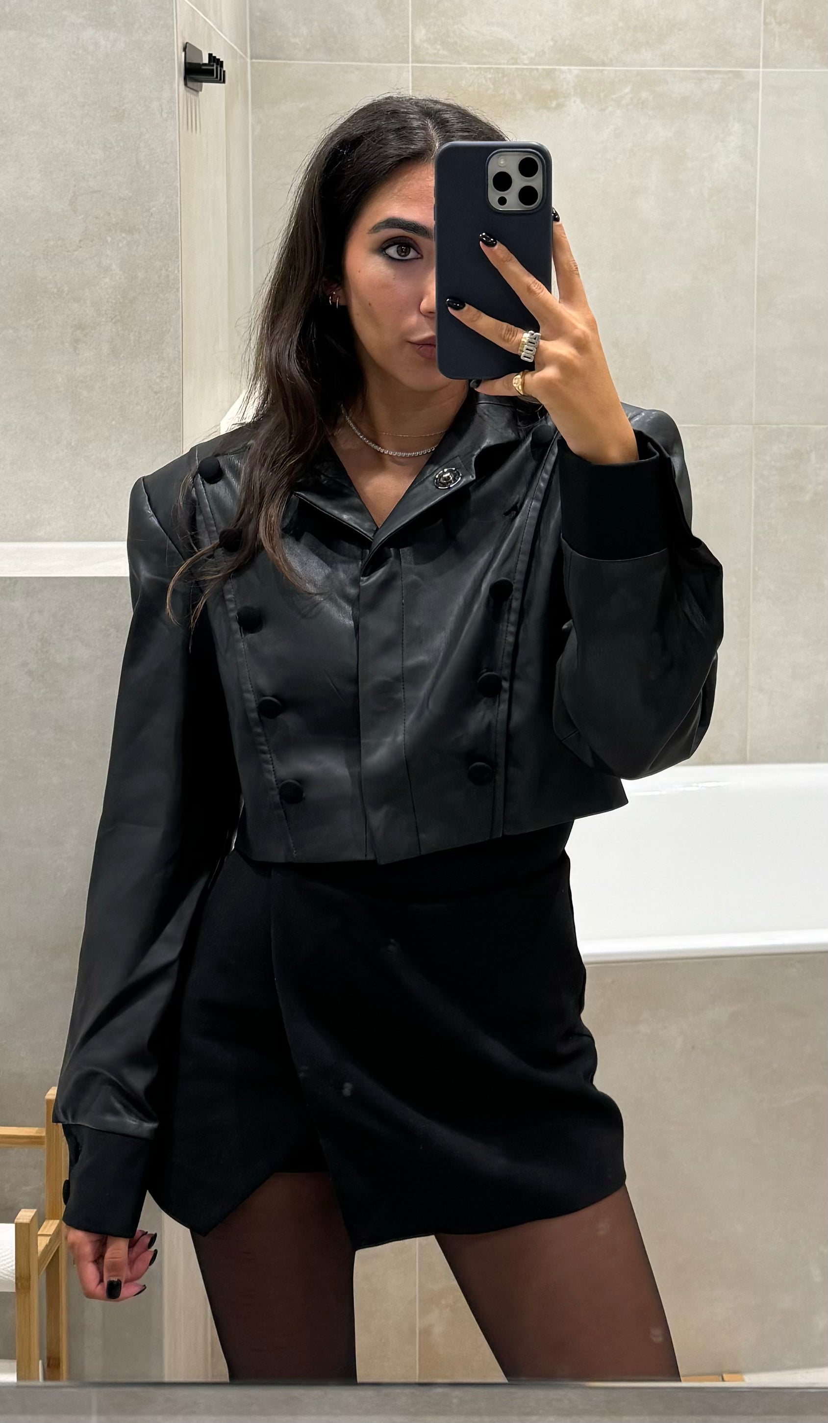 This product is styled with the Black Faux Leather High-Neck Cropped Blazer